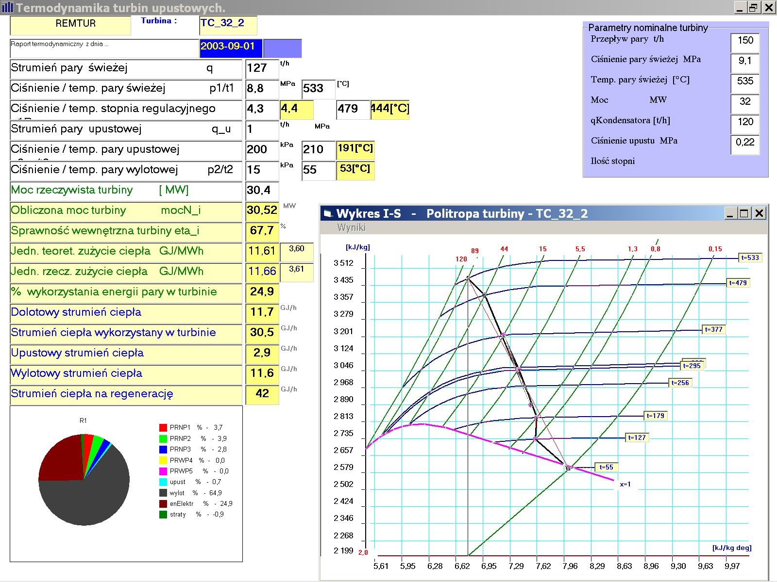 Przebieg politropy na wykresie I-S jest bardziej skomplikowany przy turbinach kondensacyjno-upustowych. Jeżeli jeszcze występują w układzie podgrzewacze regeneracyjne wówczas należy przedstawić dodatkowo schemat Hirna.