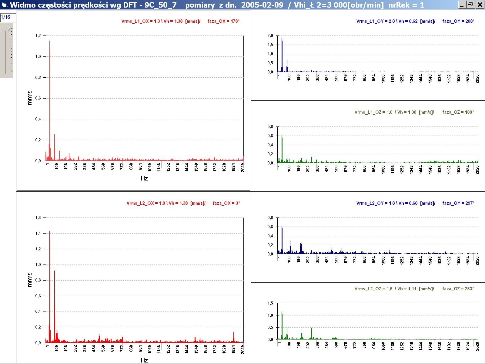 Charakterystyka przedstawia widmo drgań na dwóch sąsiednich łożyskach wg pomiaru wykonanego w czasie rzeczywistym. Rozdzielczość widma można zawsze dopasować do aktualnego pomiaru, aby jak najlepiej ustalić wartość odciętej składowej harmonicznej. Siłą rzeczy przedstawione obok charakterystyki dotyczą zapisu chwilowego. Dobrze jest jednak przyjrzeć się zapisowi w funkcji czasu. Po ustaleniu, podczas pomiaru, stałej czasowej – uzyskujemy, po obróbce numerycznej, charakterystykę kaskadową. Może ona łączyć pomiary wykonane w danym dniu z pomiarami historycznymi. Taka forma przedstawienia wyników jest najbardziej optymalna do analiz.